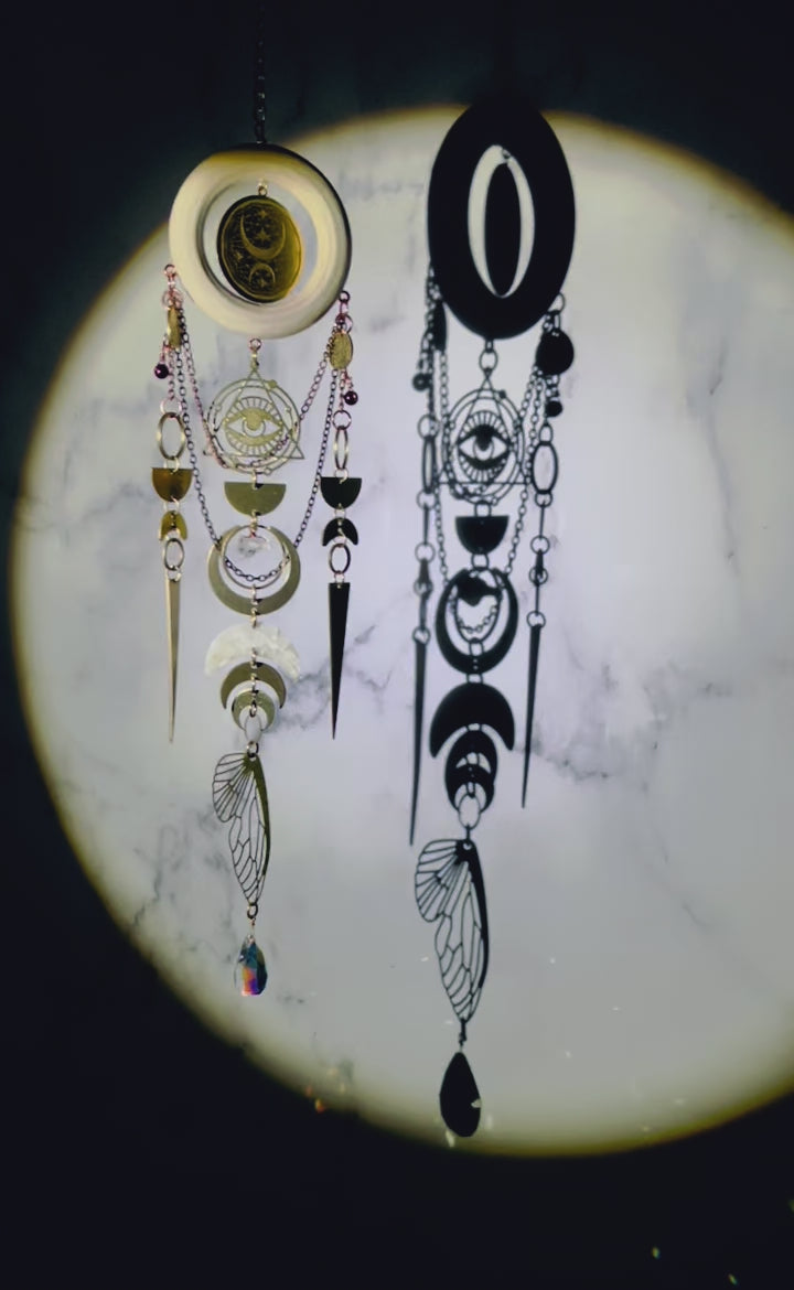Because they are small, manifestation minis and charms look excellent next to a couple other pieces of art, in a grouping of three or more. They also look very nice when hung on plants as an adornment.